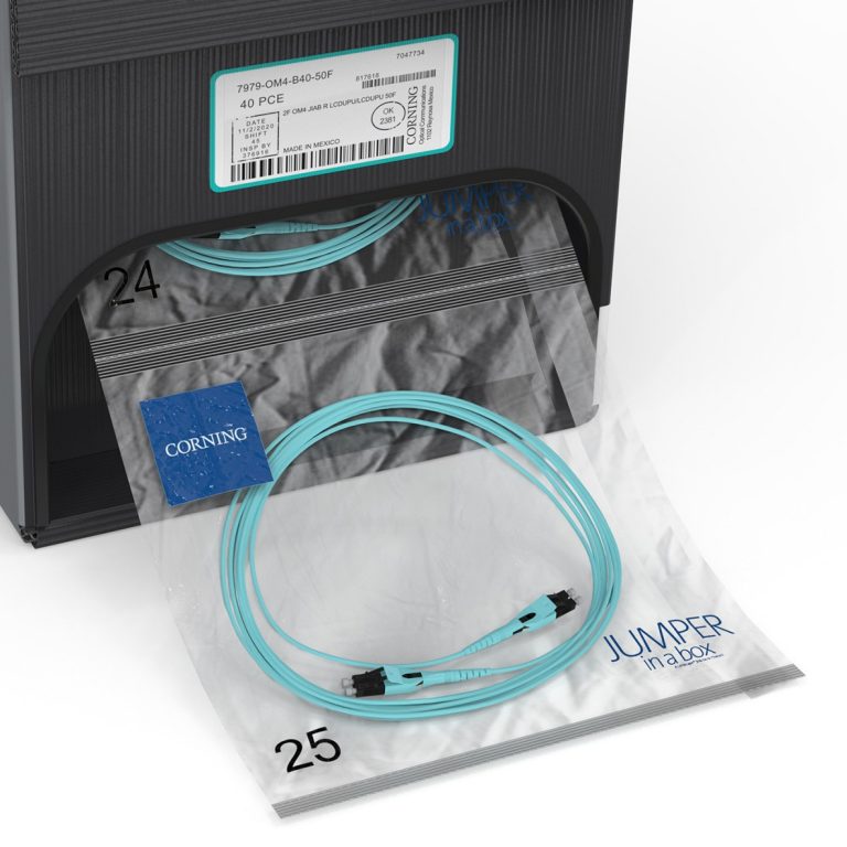 Designed to streamline inventory management, the Corning Jumper in a Box (JIAB) solution is available with data center-friendly corrugated plastic. This JIAB option offer a stackable, standard size box that contains up to 70 jumpers. All the core product information is clearly visible on the box, including part number, fiber mode, and jumper length.
