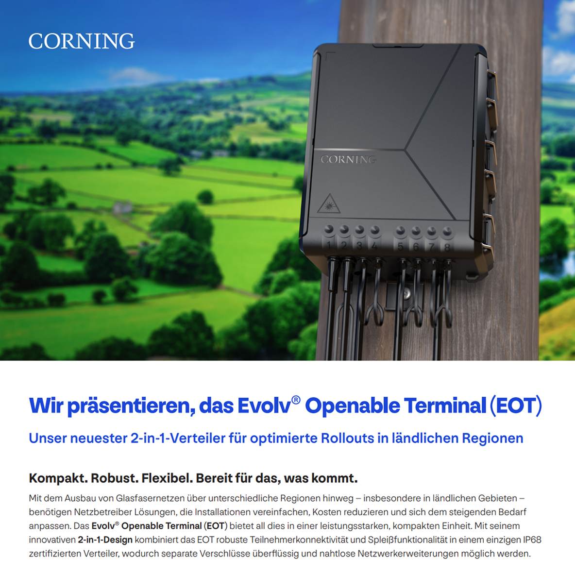 Muffe und Terminal in einem – erleben Sie das Beste aus beiden Welten mit unserem neuen Evolv® Openable Terminal: einer einzigen, kompakten Einheit, die sowohl als Glasfaserterminal als auch als Spleißmuffe fungiert.