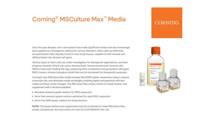 Corning’s new MSCulture Max media increases final hMSC yields, streamlines culture, reduces in-process risk, and eliminates media exchanges, enabling higher cell expansion with less media and fewer media changes. The MSCulture Max media consists of a basal medium and supplement with 3 versions available: